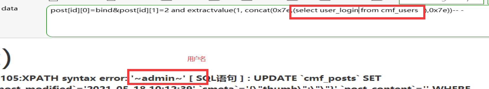 使用报错注入函数updatexml()函数报错输出用户名(也可以使用extractvalue())
